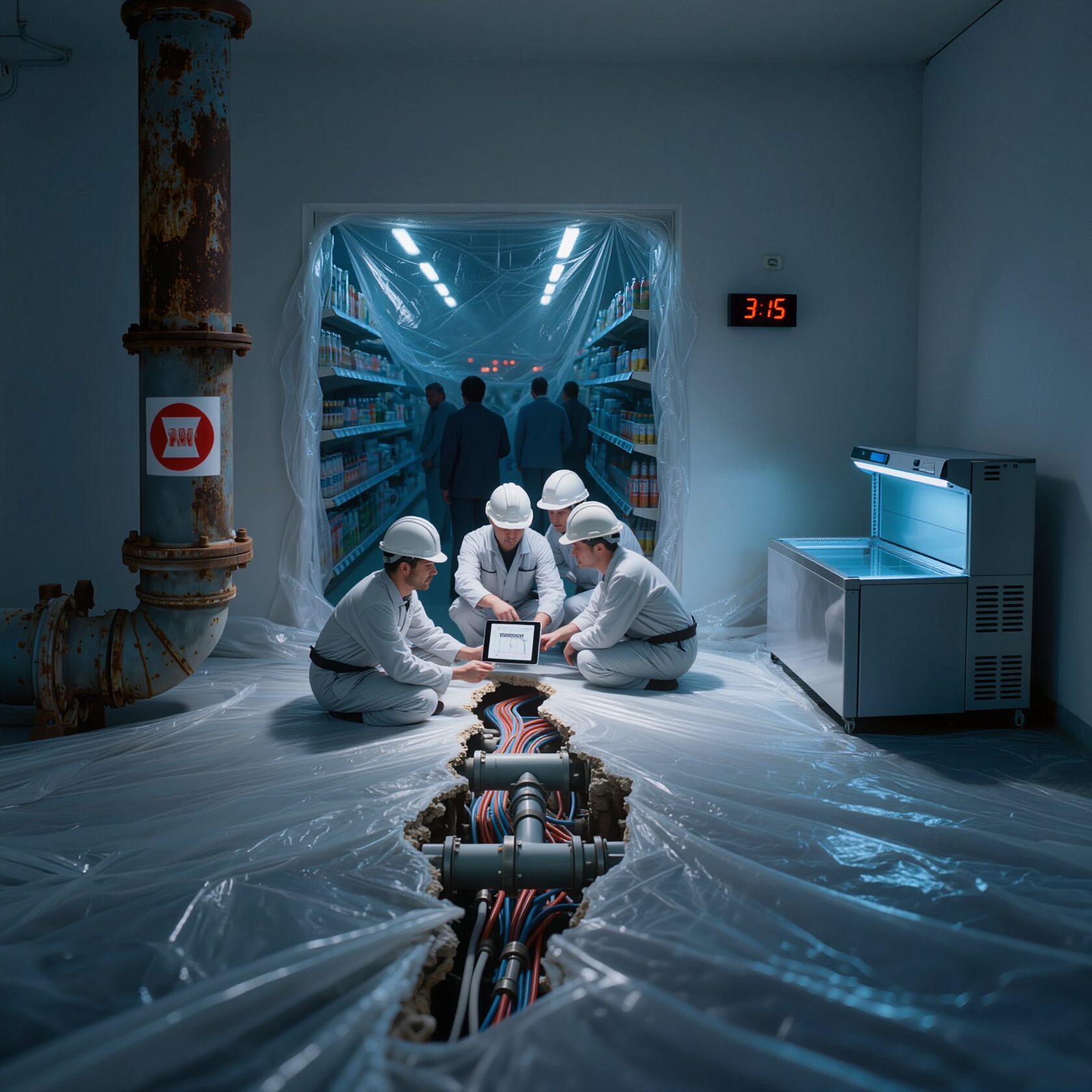 Особенность ремонта супермаркета: Это не стройка в чистом поле. Это операция на живом организме. У вас есть жесткое окно: часто работы идут ночью, чтобы утром открыть двери для покупателей. Холодильное оборудование нельзя отключать надолго. Грузовые зоны должны работать бесперебойно. Вентиляция, электрика под торговым оборудованием, полы, выдерживающие нагрузки тележек — всё это не терпит приблизительности.